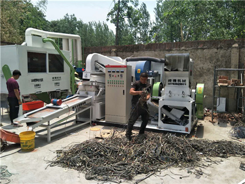 電線粉碎分離機(jī)將廢舊電線打碎成很小的銅和塑料顆粒,后經(jīng)氣流分選機(jī)物料在氣流和振動(dòng)的作用下實(shí)現(xiàn)銅和塑料的分離。